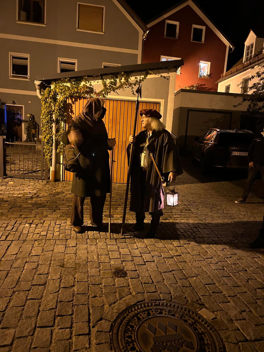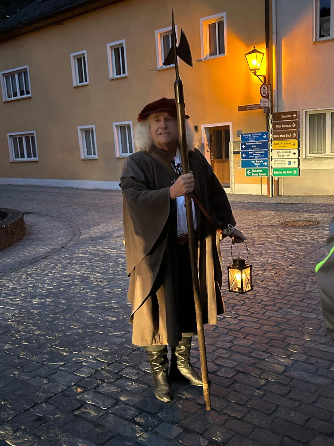 Bernhard Hübl sen., in der Rolle als Nachtwächter, führte uns über zwei Stunden durchs nächtliche Kallmünz und erzählte uns viele Gegebenheiten und Geschichten über diesen wunderschönen „Künstlerort“.